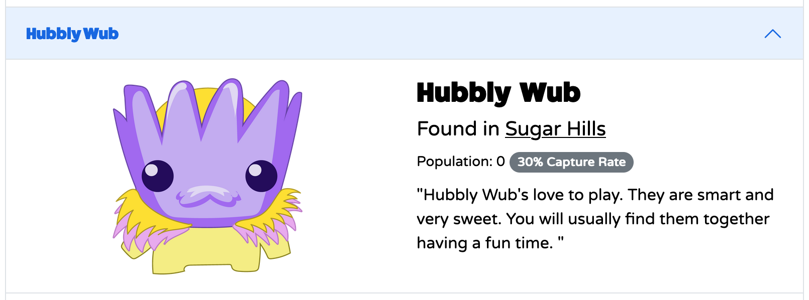 A new Pixy Pet has been found in Sugar Hills! The "Hubbly Wub" is a kind and friendly creature that loves to eat cupcakes. They also love to go on quests. To capture one, use a toy or treat from the Sugar Hills Toy Store.